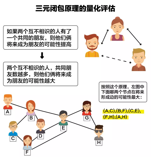 这题用到的是社会学中经典的“三元闭包原理”,即如果两个人有个共同的朋友,那么这两人成为朋友的可能性会增强。原因有三:第一,这两人会因此有更多见面机会;第二,因为有共同朋友双方信任会增强;第三,那个共同朋友会有一定的心理压力(潜意识里会担心这两人对他有意见)。这个原理说明,社会结构中会蕴含信息。而用应用数学中的图论作为基本工具把这一原理呈现出来,就可以很好地研究社会网络的结构,进而推演出信息,进而更能理解原理。