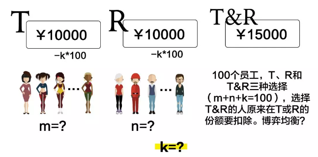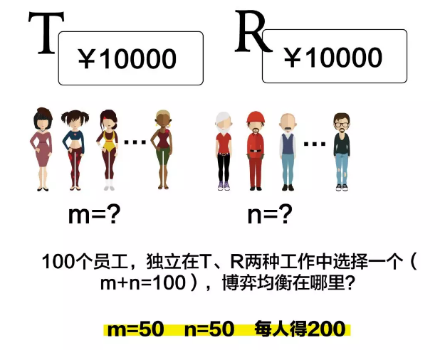 T和R是两种性质完全相同的工作,因此参与T的有50人,参与R的也有50人,每人得200是最好的选择。