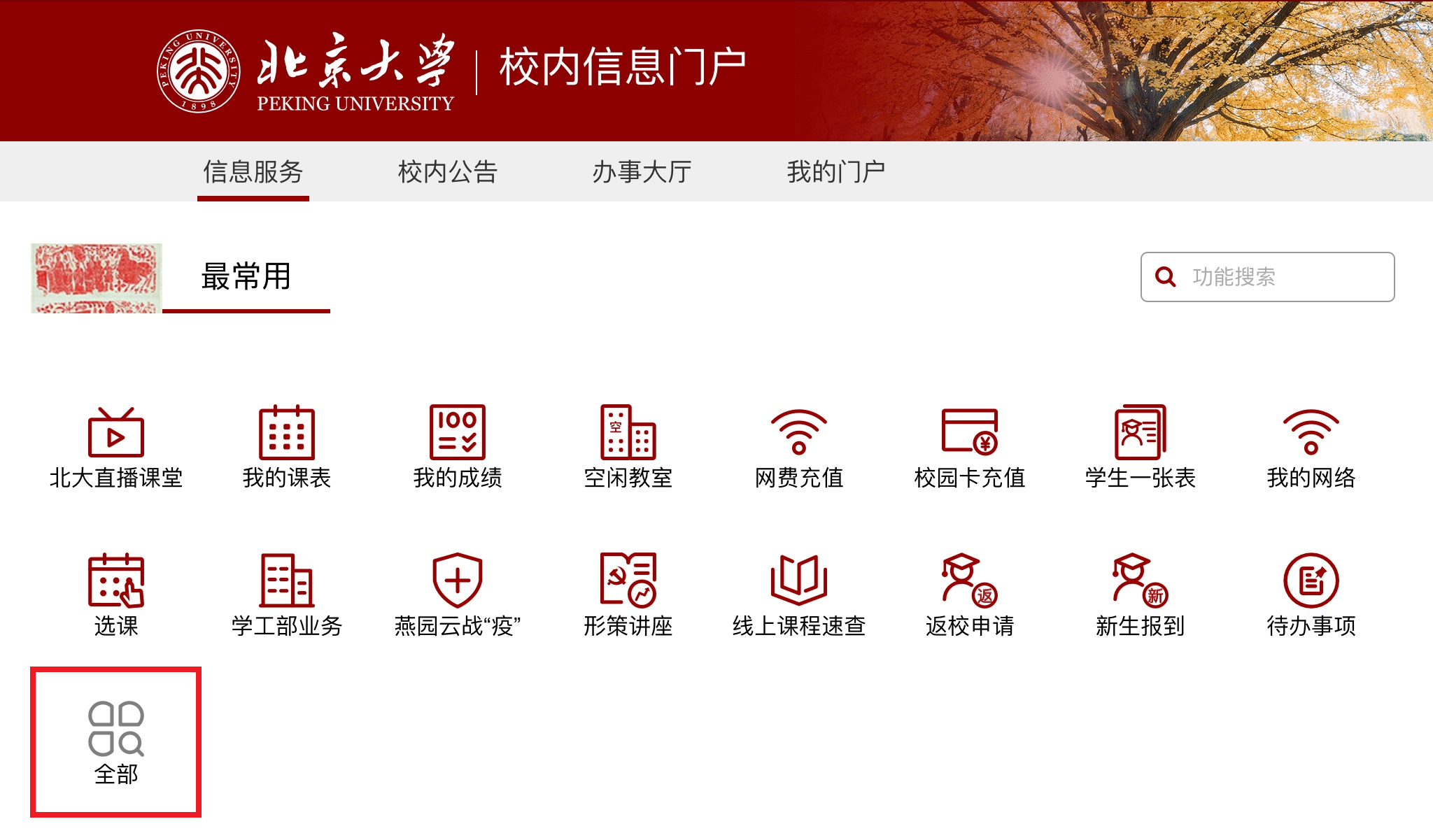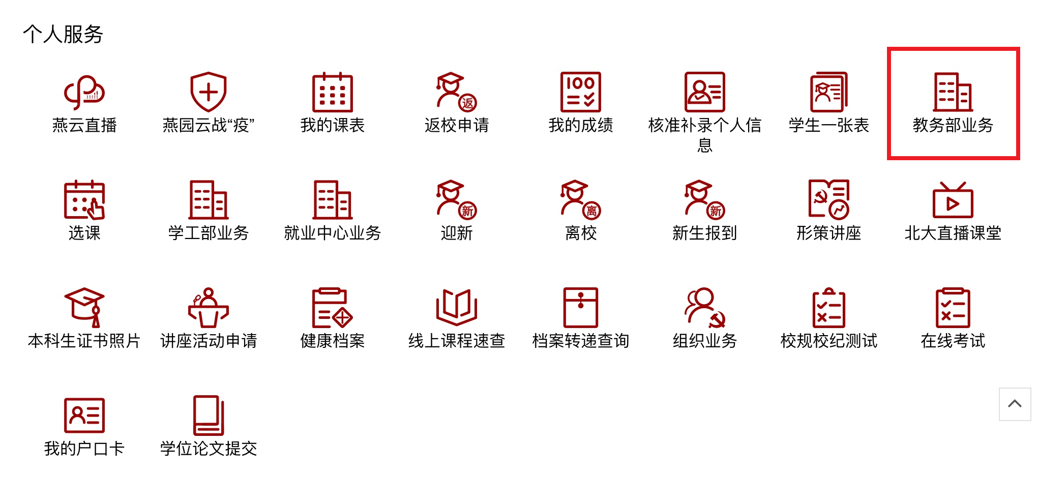 (1)符合推免条件的学生用本人学号和密码登录校内门户(https://portal.pku.edu.cn/),选择“信息服务”--->“全部”--->“个人服务”--->“教务部业务”--->“推免资格申请”: