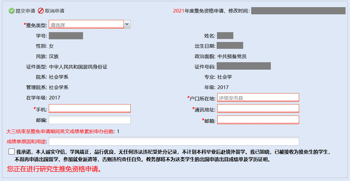 所有参加推免的同学,务必在规定期限内通过校内门户在系统中提交推免资格申请,逾期不再受理。