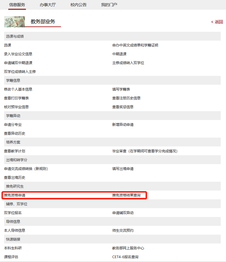 (2) 学生也可通过系统对推免资格进行结果查询,用本人学号和密码登录校内门户(https://portal.pku.edu.cn/),选择“信息服务”--->“全部”--->“个人服务”--->“教务部业务”--->“推免资格结果查询”。